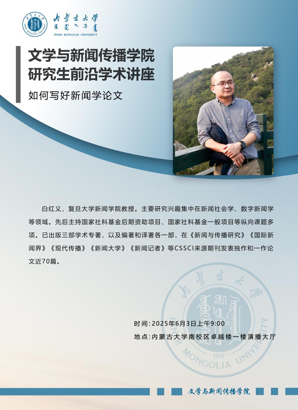 6月3日上午,我院在南校区卓越楼一楼演播大厅举办了题为《如何写好新闻学论文》的专题讲座,主讲人为复旦大学新闻学院教授白红义。他结合自身研究与行业实践,围绕新闻学论文的核心要素与写作要点展开深度分享。本次讲座为我院马克思主义新闻观系列讲座之一。 主讲人白红义教授主要研究兴趣集中在新闻社会学、数字新闻学等领域。他先后主持国家社科基金后期资助项目、国家社科基金一般项目等纵向课题多项,已出版三部学术专著...