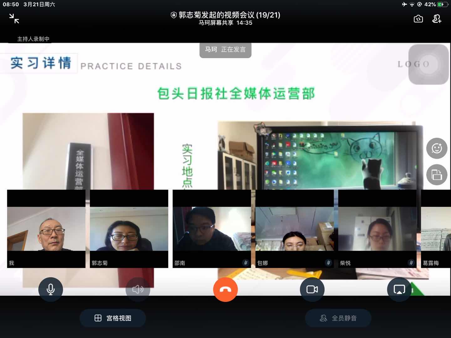 郭怡同学的实践单位是央视网《我的军旅梦》节目组,实习中她深入到训练一线,与军人们共同经历风雨,把“铁汉”背后的热血故事传达给观众。蒙汉兼通的王伟伟同学在答辩中说:“我采访能力不足,每一次采访遇到的问题我都记录下来并不断总结,尽量避免错误再犯。”闫石同学更是通过色彩饱满的图片和激情的讲述将“湖南卫视”自由、独立的工作气氛传达给大家。老师们对同学们的实习工作做出了积极肯定,并告诫同学们做任何事都要保持认真的态度,对自己负责也是对新闻负责。虽然隔着电脑屏幕,但答辩各组的火热气氛丝毫不减。