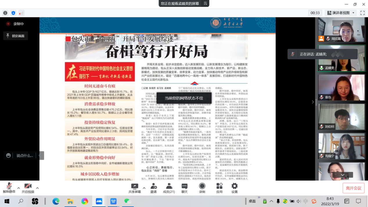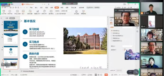 2022年3月19日上午,yl23455永利集团2022届新闻与传播硕士专业学位研究生实习报告会以腾讯会议为平台在线上举行。新华社内蒙古分社原政文部主任汤计、中央广播电视总台宁波记者站原站长焦健、光明日报内蒙古记者站站长高平、内蒙古日报社媒体融合部主任郝斌四位校外导师与张丽萍副院长、刘寒娥主任等八位校内导师担任答辩评委。报告会上,同学们展示了自己的实践成果,并对评委们提出的问题进行了答辩。