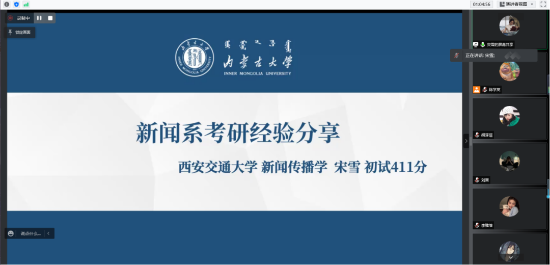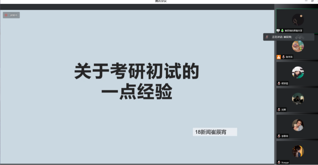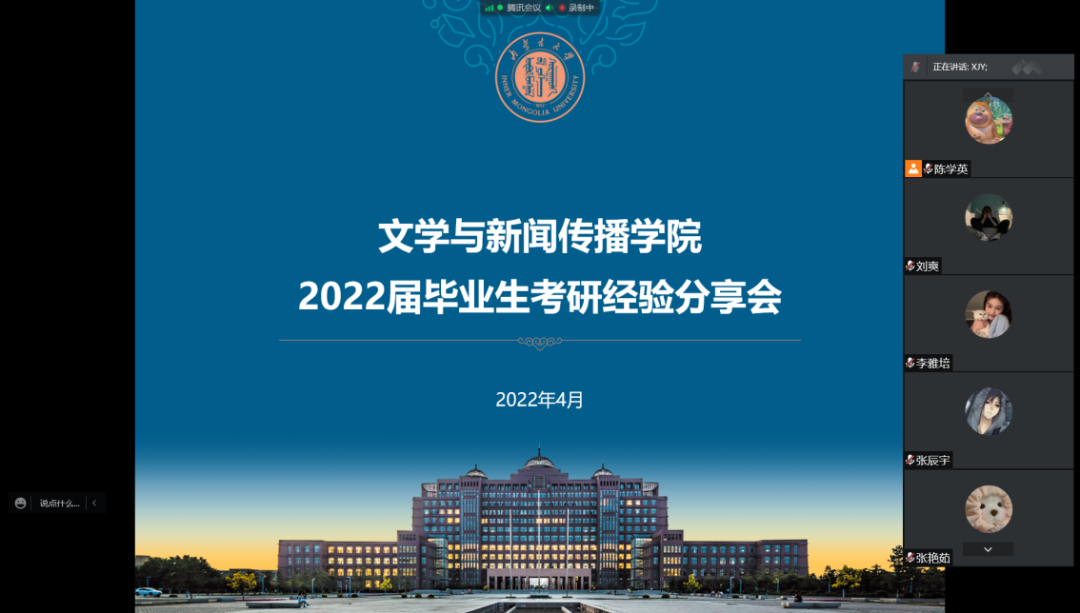4月12日、13日下午2:30,我院通过腾讯会议分别开展了2022届新闻系、汉语系毕业生考研经验专场分享会,邀请2018级崔辰宵、邬旭、宋雪、吴娱、褚碧涵、董美杉共6位学长学姐为同学们分享考研经验。分享会由我院本科生辅导员邢佳玥老师主持,2019级全体本科生参加会议。