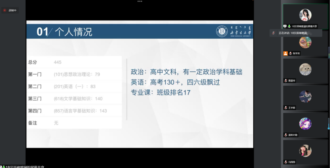 吴娱,2018级汉语言文学专业学生,考研至兰州大学汉语国际教育专业。作为跨专业考研学生,她向同学们分享了一些跨专业考研的经验以及背诵的技巧。她建议同学们在背诵专业课时要多总结、多思考、多积累。在确定目标院校后,要尽早开始准备,打有准备之仗。
