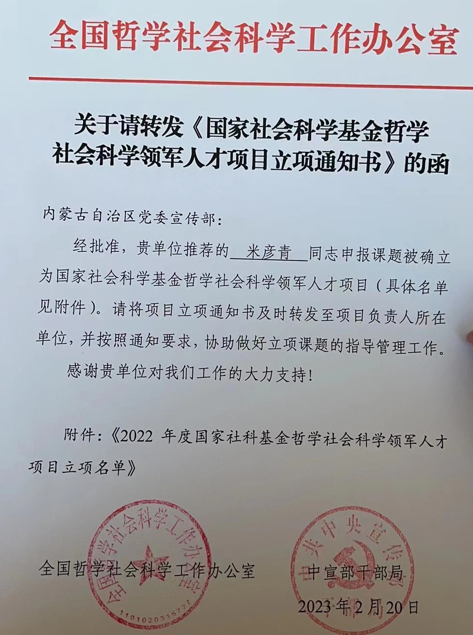 2月20日,全国哲学社会科学工作办公室及中宣部干部局,向内蒙古自治区党委宣传部发布《关于转发<国家社会科学基金哲学社会科学领军人才项目立项通知书>的函》,文中表示,经全国哲学社会科学工作办公室批准,我院米彦青教授申报课题被确立为国家社会科学基金社会科学领军人才项目。该项目首次设立,体现出我院教师在凝练研究方向方面的重要突破。