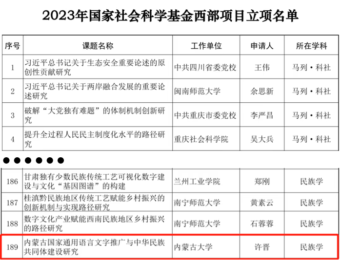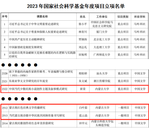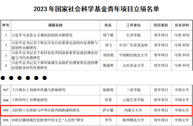 9月4日,2023年国家社会科学基金年度项目和青年项目立项名单进行了公示,我院崔荣老师获批重点项目;白叶茹老师、范云晶老师获批一般项目;萨日娜老师获批青年项目。9月19日,2023年国家社会科学基金西部项目立项名单进行了公示,我院许晋老师获批西部项目。