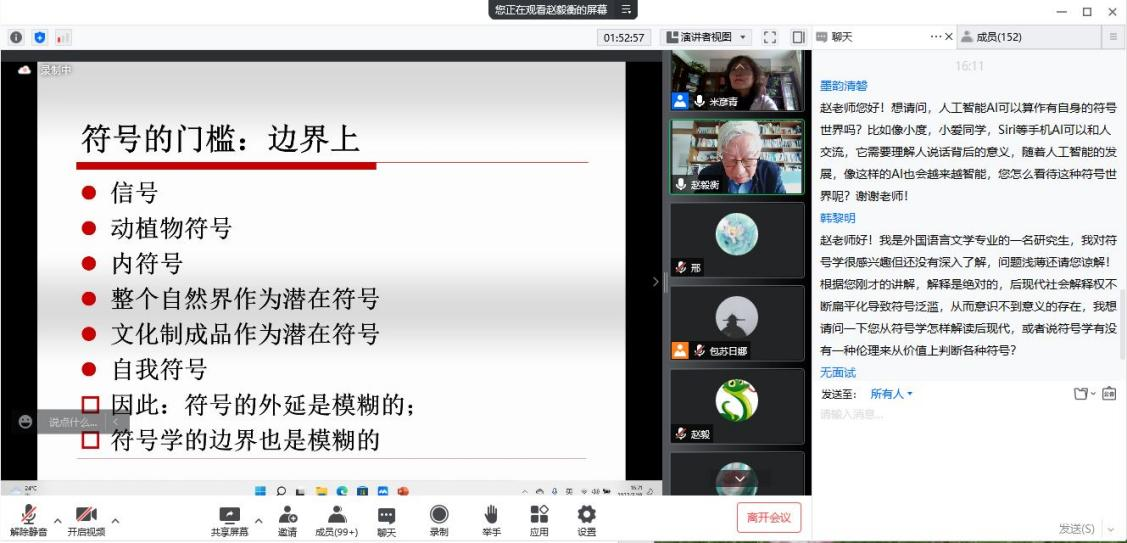 2022年5月19日下午14时30分,四川大学赵毅衡教授为我院师生带来一场题为“什么是符号?什么是符号学?”的线上讲座。讲座由副院长米彦青教授主持。近200名师生参加了本次讲座。