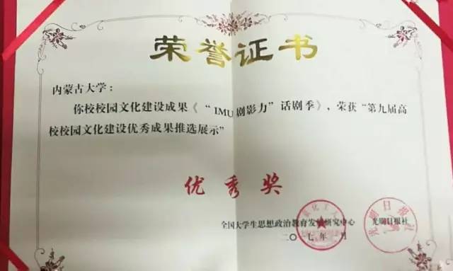 在2016年11月,我院接到自治区教育厅转发文件《关于开展第九届高校校园文化建设优秀成果推选展示的函》,我院依照文件要求积极准备申报,精心梳理近两年“IMU剧影力”话剧季活动资料,特别是将去年在乌兰恰特保利大剧院上演的剧目《窝头会馆》作为重点材料,整理演出前后期的宣传资料及演出视频,认真撰写申报材料。经过学校推荐与自治区教育厅审核上报,最终,我院“IMU剧影力”话剧季获评“第九届高校校园文化建设优秀成果推选展示”优秀奖。