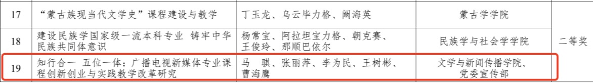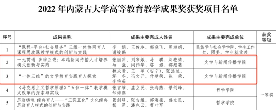为奖励在教育教学实践中取得显著成果的单位和个人,发挥优秀成果在教育教学改革、实践和研究中的示范和引领作用,按照自治区教育厅关于做好 2022 年自治区级高等教育教学成果奖评审工作有关要求,学校组织开展了 2022 年永利y23455高等教育教学成果奖评审工作。在各单位、各部门积极申报的基础上,经学校教学成果奖评审委员会办公室资格审查、专家组评审、网上公示等程序,共评选出 2022 年永利y23455高等教育教学成果奖 40 项,其中,一等奖 16 项、二等奖 24 项。我院魏永贵老师团队和张丽萍老师团队获一等奖,马骐老师团队获二等奖。该项评选和奖励工作有力促进了我院教育教学成果的创新发展,对于我院积极从事教育教学改革与实践研究,不断提高育人本领和教育教学质量发挥了重要作用。