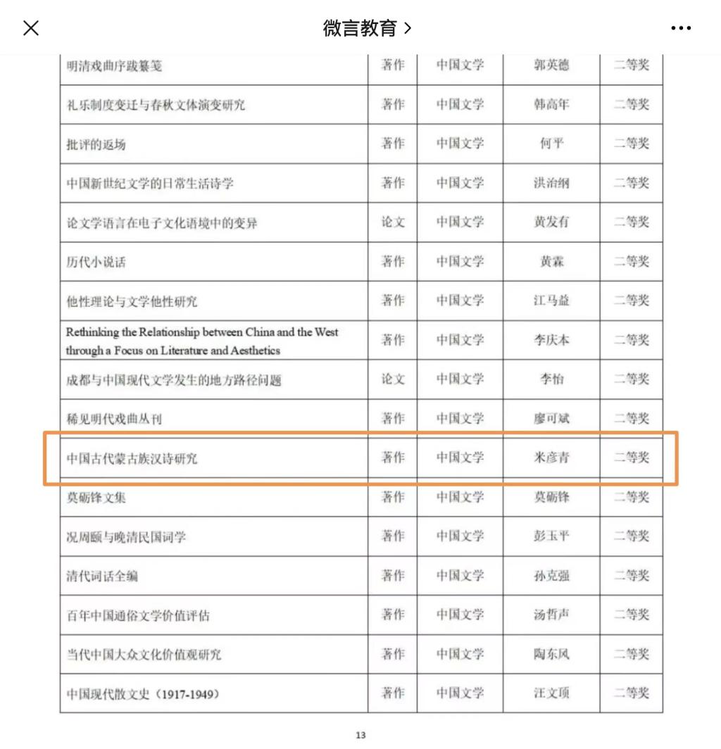 2月6日,教育部对第九届高等学校永利集团优秀成果奖(人文社会科学)评选成果进行公示,我院米彦青教授所著《中国古代蒙古族汉诗研究》荣获著作论文奖二等奖。