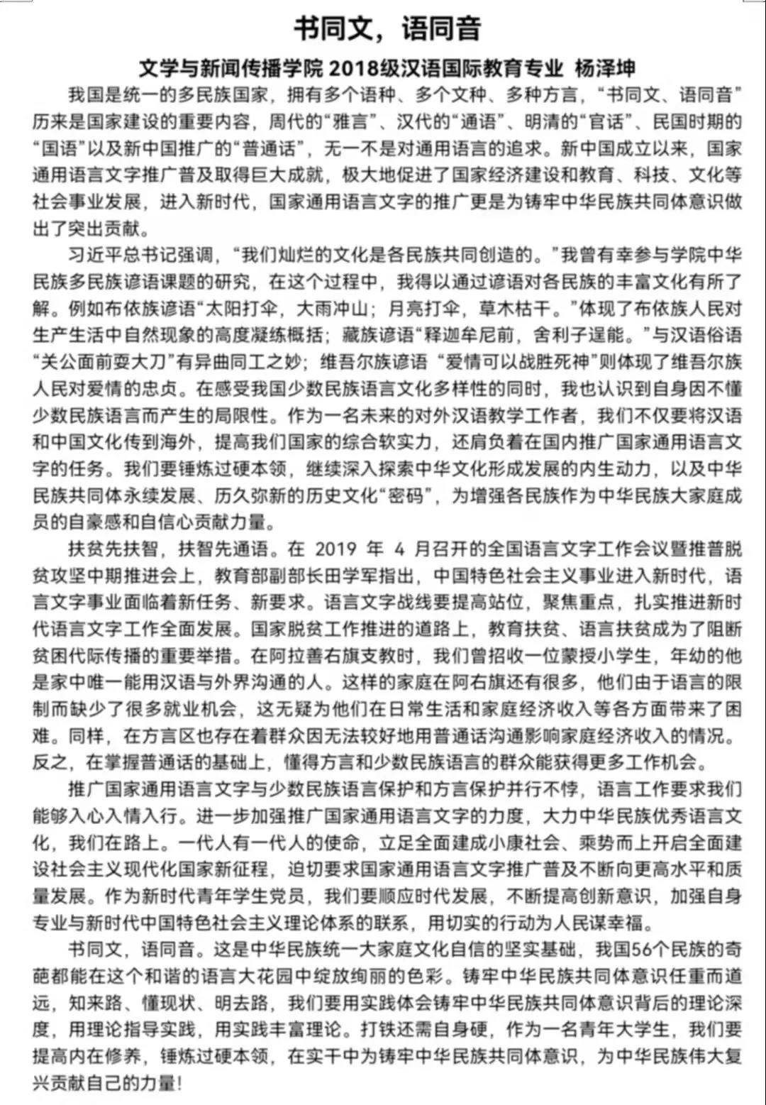 9月13日,2018级汉语国际教育专业团支部以“铸牢中华民族共同体意识”为主题,举行了线上团日活动。支部团员均参与到讨论之中,积极发言。同学们结合近期的思政学习,交流对“中华民族共同体意识”的理解;部分同学也分享了自己的实践经历和所见所感。杨泽坤同学分享到:“扶贫先扶智,扶智先通语。书同文,语同音,这是中华民族统一大家庭文化自信的坚实基础,作为一名青年大学生,我要提高内在修养,锤炼过硬本领,在实干中为铸牢中华民族共同体意识,为中华民族伟大复兴贡献自己的力量!”