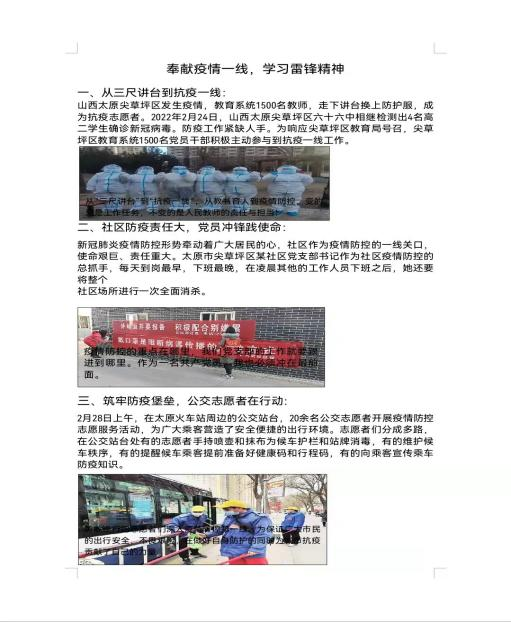 用雷锋精神描绘“志愿红”,我院学生组织成员一直在路上。职业发展部陈闻笛同学与舍友们随永利y23455微尘志愿者协会到达晓霞特教康复中心开展志愿活动,为残障的小天使们送去关爱,感悟生命的另一种真谛;综合协调部李昊宇同学善于发现生活中的无名战士,默默用文字记录了太原火车站边20多名志愿者开展志愿活动的奉献举动;学习实践部阿苏茹同学心怀崇敬之心,认真整理了当代雷锋的感人事例......
