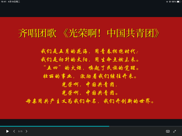 2019级汉语国际教育专业团支部首先组织青年团员齐唱团歌《光荣啊,中国共青团》。随后按照时间顺序接力回顾党从建党初期、新民主主义革命时期、社会主义革命时期、到改革开放新时期的青年运动史,引导支部团员牢记总书记嘱托,坚定前进信心,立大志、明大德、成大才、担大任。最后,团支部书记组织同学们重温入团誓词,并鼓励同学们在课下主动使用“团务百科”等小程序提升自身理论素养,坚定爱国情、强国志的理想信念,为日后更好地学习工作提供源源不断的思想动力。