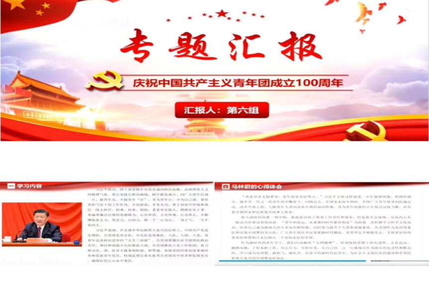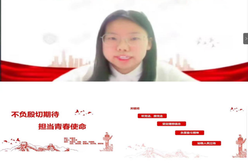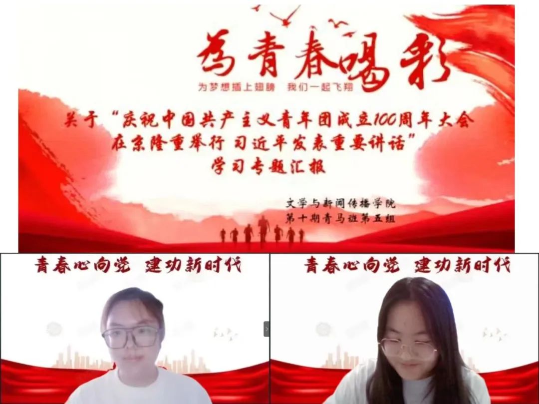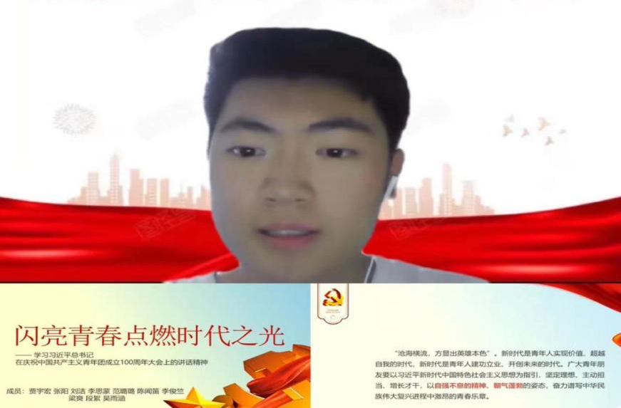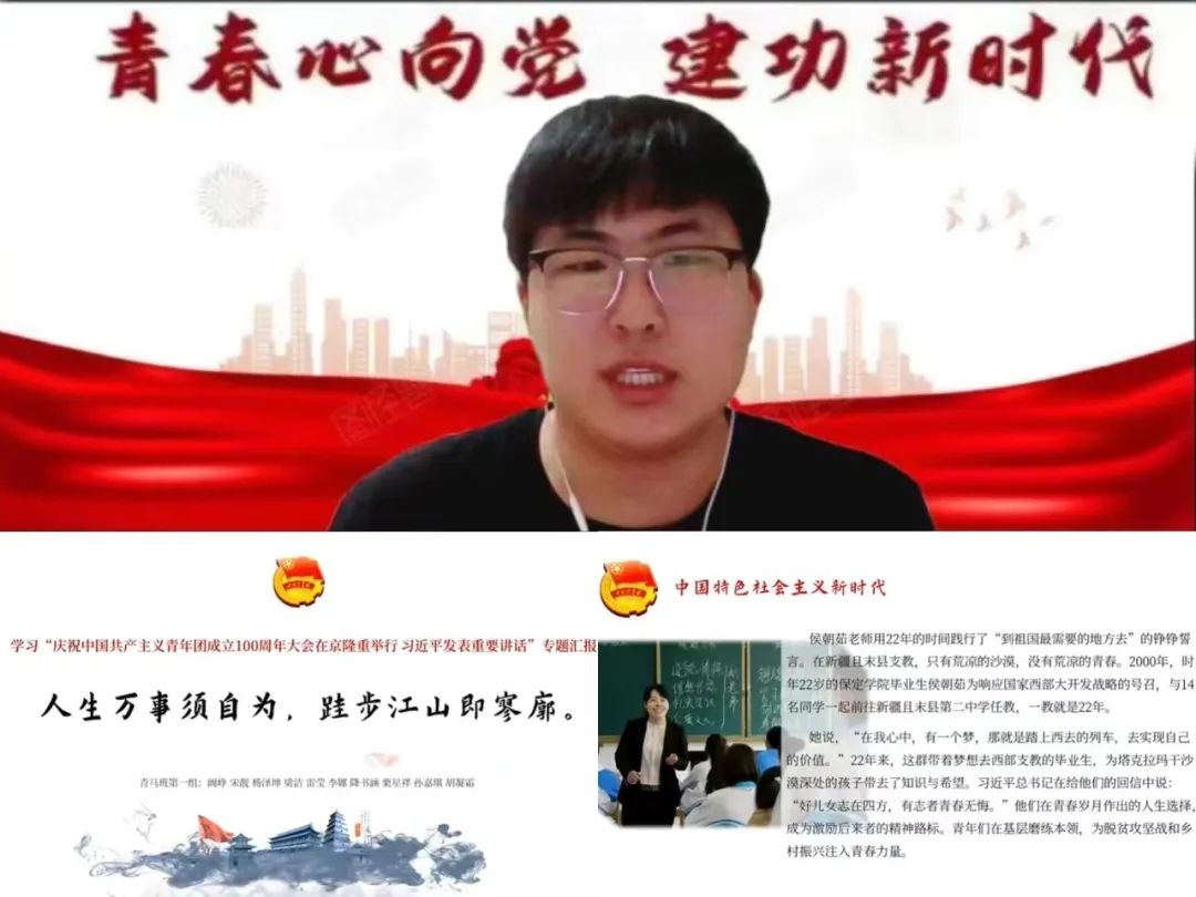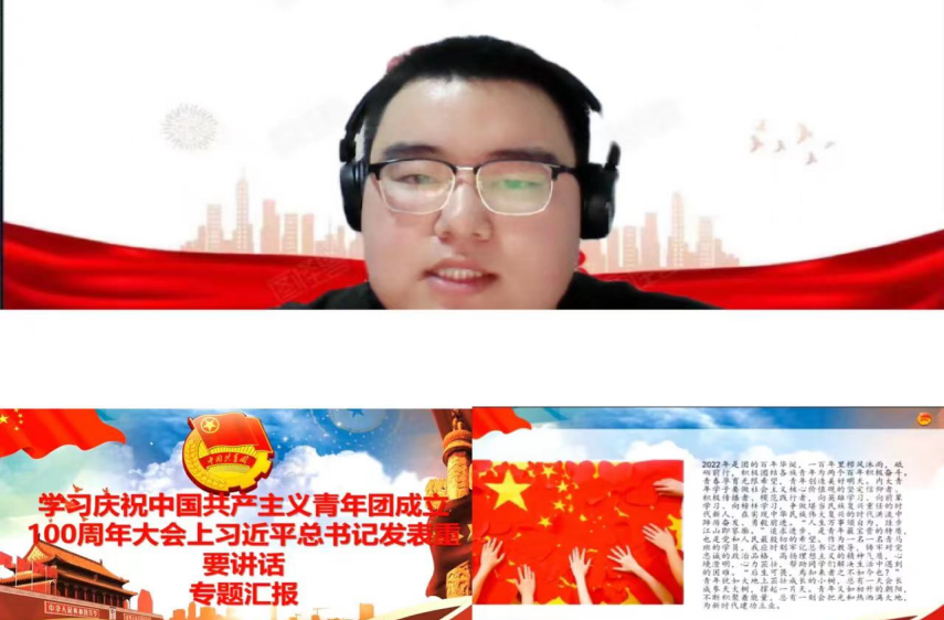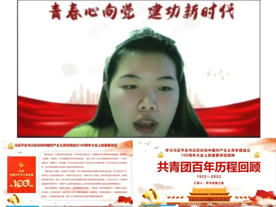 5月21日晚7:00,我院于腾讯会议平台组织青马班开展“学习习近平总书记在庆祝中国共产主义青年团成立100周年大会上的重要讲话精神”专题团课汇报展示,我院团总支副书记任文秀老师出席并主持本次活动,第十期青马班全体学员、2022年春季学期入团积极分子参加活动。学员们认真聆听学习习近平总书记重要讲话,深受鼓舞、倍感振奋,并结合所思所想以小组为单位进行汇报展示。
