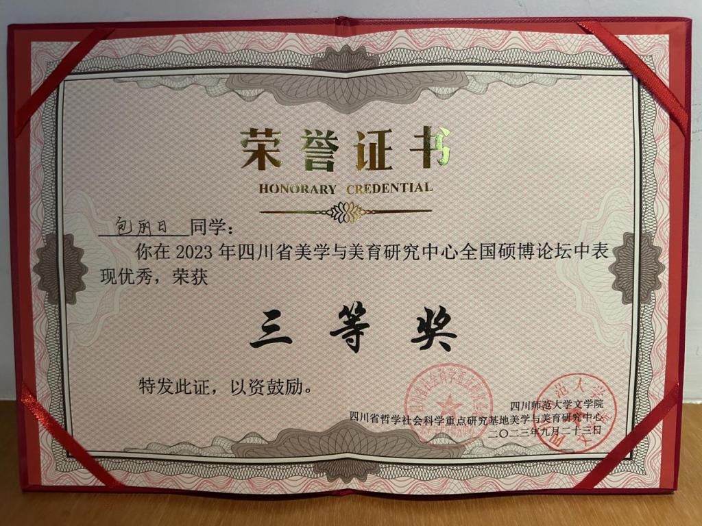 9月23日,由四川师范大学文学院、四川省哲学社会科学重点研究基地美学与美育研究中心共同主办、中华诗歌研究院协办的“四川省美学与美育研究中心2023年全国硕博论坛”在四川师范大学举行。据悉,本届论坛共收到来自北京大学、清华大学、复旦大学、首都师范大学、武汉大学、四川大学、南京大学、山西大学、永利y23455、四川师范大学等全国五十余所高校的百余篇论文,选取三十篇优秀论文进行现场报告,我院2021级艺术学理论专业研究生包丽日的文章顺利入选,受邀参与此次学术论坛。
