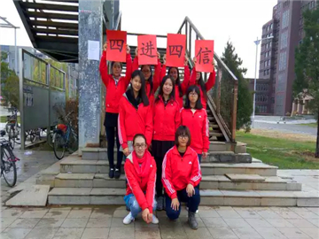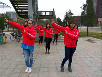 食堂北侧楼梯处的同学们则是一边高举“四进四信”,一边跟随着动感音乐“小苹果”舞动出热情而充满活力的青春风采,引得众人纷纷驻足观看。