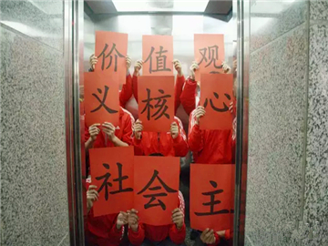 另外的一队同学则来到我校南区主楼电梯口,以“社会主义核心价值观”的标语牌迎接将要乘上电梯的老师和同学们,为他们在寒冬带来火热惊喜,也使这九字标语更加深入人心。