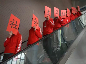 11月6日中午十二点半,学院的“快闪族”们便出现在食堂东门,统一着红色服装,举起印有“社会主义核心价值观”的标语牌,沿电梯逐级而上。