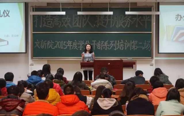 为了提高团总支学生会成员和学生干部的工作能力和自身素质,学院于2015年12月3日晚7:00在主楼DF0201举办“打造高效团队,提升服务水平”学生干部系列培训秋季学期第二场。培训的主要内容为常用公文写作与办公室礼仪,由第九届团总支兼职副书记常春婷和团总支学生会副主席陈宁主讲,学生会全体成员及各班学生干部参加了本次培训。
