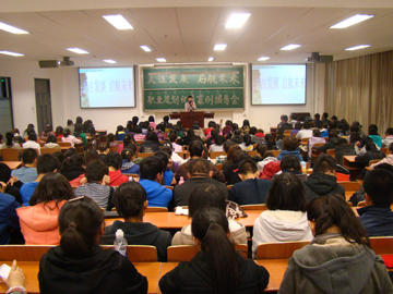 学院2008级学生云扎布、2009级学生陈轩、王桂娜三位同学分别结合自己的大学职业规划书做了具体化的报告。2009级的王桂娜与大家分享了她的就业目标和大学规划的具体实施情况;陈轩则结合自身在华数传媒和开麦拉传媒的实习实践经历,指导大家要为自己的职业目标不断地投身实践,打造过硬的专业技能;2008级的云扎布总结了自己参加内蒙古自治区和全国职业规划大赛的经历和在北京文化传播公司实习所积累的经验,向同学们提出了“职业规划其实就在你身边”、“明确目标的重要性及构建方法”和“职业规划是一个不断重复认知、深化认知的过程”的实用方法。他建议同学们,规划意识必须从大一树立,所有计划必须付诸于点点滴滴的实际行动,才能在大学期间实现全面发展,为将来的就业发展奠定基础。