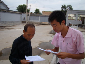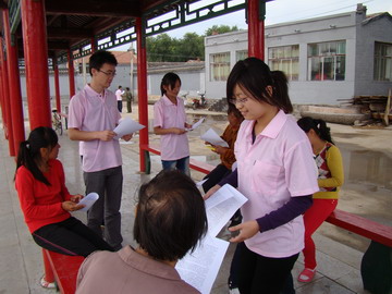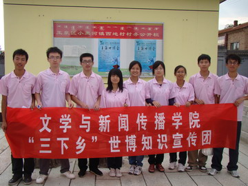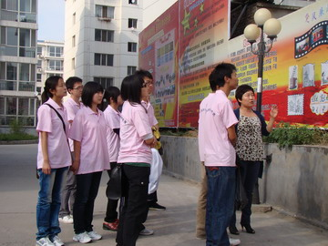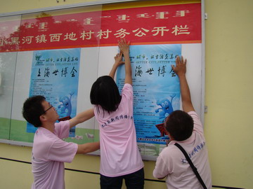 ,实践团来到呼和浩特市玉泉区西地村,进行了“世博知识进农村”的义务宣讲活动。在西地村村委会前,宣讲团张贴了宣传世博知识的海报,并将一张张宣传资料送到居民手中,通俗而又耐心地讲解“世博”知识,并向村民展示上海世博会吉祥物“海宝”,宣传世博会“理解、沟通、欢聚、合作”的主题意义。宣传工作结束之后,队员们和村民们坐在一起,同他们谈正在举行的世博会、今年的玉树大地震、西南干旱问题等,通过谈话,使当地更多的村民关注国情、关注世博、关注时事。