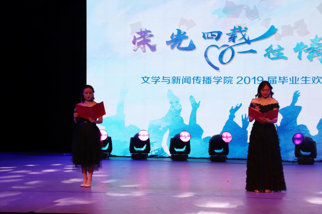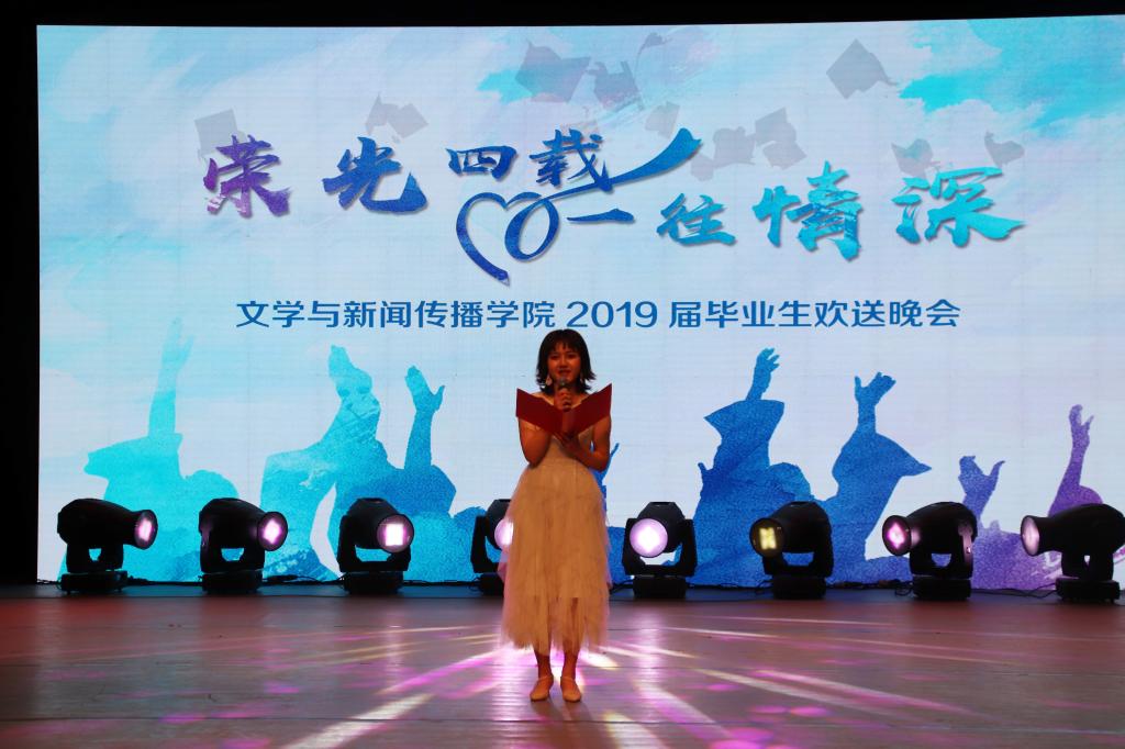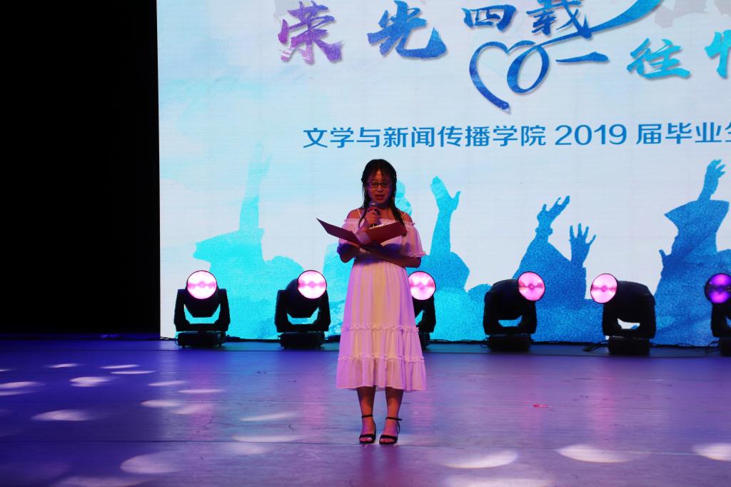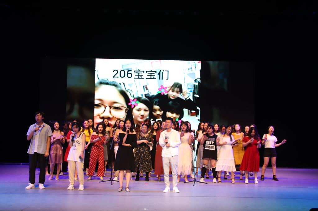 情不知所起,一往而深。 2019届毕业生们在小剧场舞台上留下了自己最美丽的身影。5个班级的同学全部登台亮相,用歌声唱出青春,用舞蹈释放热情,度过了一个难忘的毕业之夜。晚会上各个节目在引起观众欢呼的同时,也让许多同学在回忆中流下了感动的泪水。晚会进行时,五个毕业视频分别展现了不同的回忆与感动,之后各班才子陆续登场,现场的欢呼声此起彼伏。其中也加入了四位毕业生代表读信的环节,信中表达了他们对于母校、恩师、挚友、亲朋的真挚感情。晚会进行到最后一个节目时,2015级新闻班的班主任郭志菊老师登台参与了与毕业生们的最后一次合唱,再一次燃起了现场的气氛。