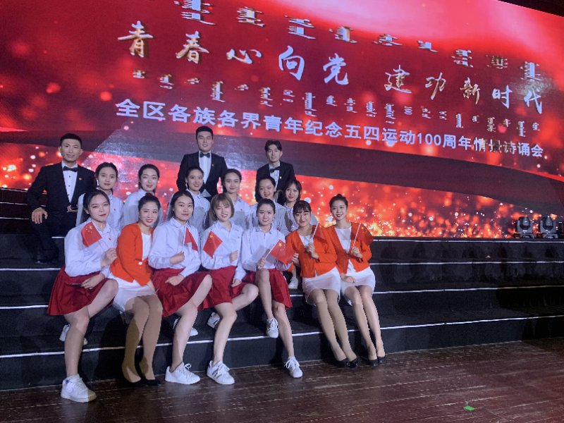 4月29日上午,在内蒙古人民会堂,我院三十八名青年学生代表内蒙古50万青年大学生参加了“青春心向党,建功新时代”全区各族各界青年纪念五四运动100周年情景诗诵会。
