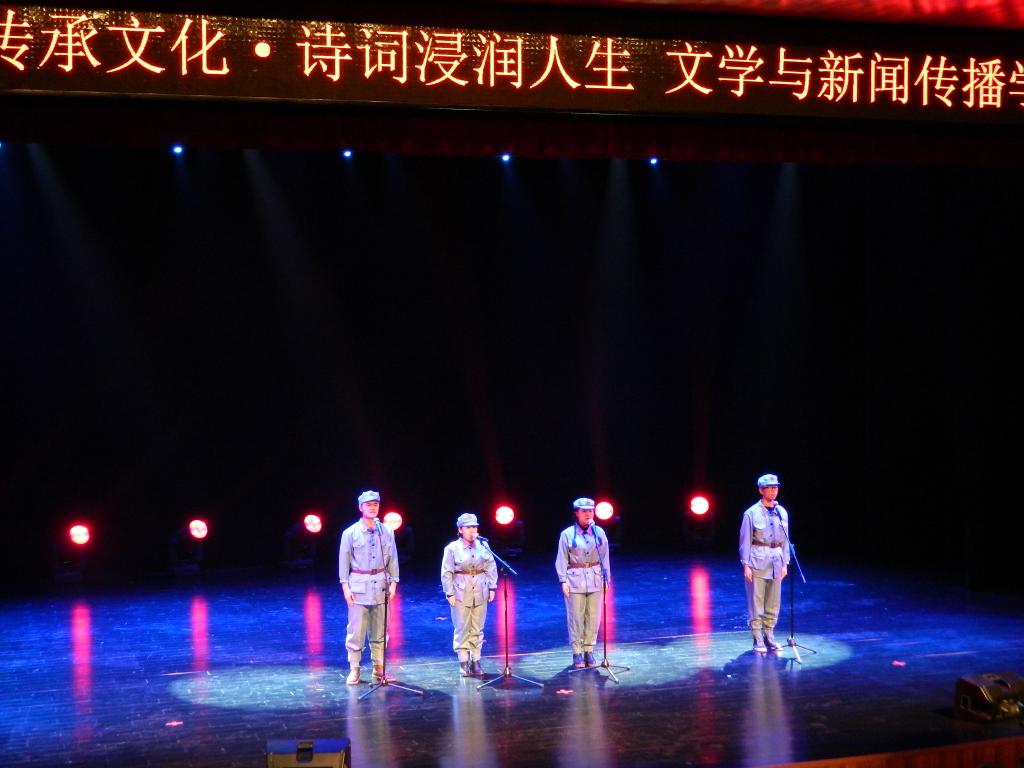 在一片欢呼声中,我院姜德军老师、远心老师、高欢欢老师、马瑜泽老师、胡首龙老师盛装出场,拉开了第二篇章的序幕,一组长诗《呼伦贝尔大荒经》,将我们带到了辽阔的呼伦贝尔大草原;四位同学共同演绎了青年教师、青年诗论家鄢冬的原创诗歌《诗,我挚爱的魂灵》,让我们一起感受诗在阳光下的色彩斑斓;《西去列车的窗口》、《在变老之前远去》,表达了当代青年传承奉献精神,支援西部,到祖国最需要的地方,投身建设家乡的勇气。第二篇章最后,由刘志中、鄢冬、李旺三位老师带来艾青的《北方》,将晚会的气氛推向高潮,让现场观众尖叫不断。