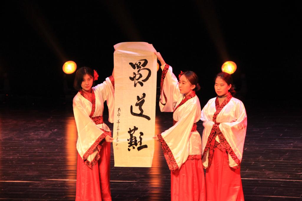 晚会在学生会成员带来的《蜀道难》中拉开帷幕,悠扬的朗诵声,婉转的古筝伴奏,流畅的书法表演,仿佛将现场观众一起带回了那个“噫吁嚱,危乎高哉!”的盛唐时代。