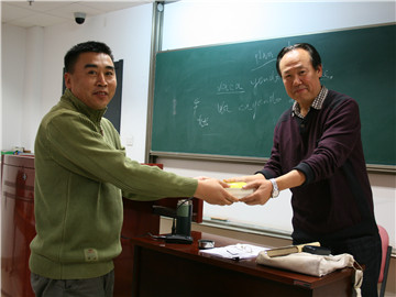 讲座临近结束,赵老师将自己翻译的诗集《龙与月》送给在座的文研班学员,并合影留念,赵老师衷心的祝愿在座的每一位学子,希望他们能够更好地把握文学翻译理论原则、标准依据、翻译技巧并且希望他们能够在文学翻译这条具有独特魅力的道路上能够走的更远。