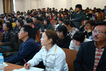 | 文新院院长李树新教授(左二)副院长王芳教授(右二)听取讲座 |