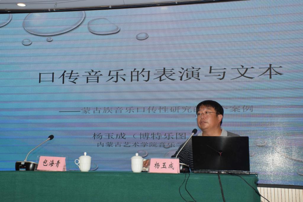 杨玉成教授题为“口传音乐的表演与文本——蒙古族传统音乐的四个案例”的专题讲座将12日下午的学习推向又一个高潮。杨老师用口传诗学将传统注重音乐本体的研究和将音乐作为文化现象的研究结合起来,指出在口头叙事艺术中音乐是稳定的力量,并通过口传音乐的表演与文本对比,提炼出具有共通性质的结构——曲调框架。最后,杨老师就自己正在进行的研究“失传史诗表演的逆向重建”,邀请逆向重建表演者七山现场演唱。他认为非遗保护可以有多种形式,不仅有原生态保护,也有次生态保护、再生态保护和文本保护。杨玉成教授对研究对象发自内心的热爱令听者动容,他对学术的热情令青年学者敬佩。