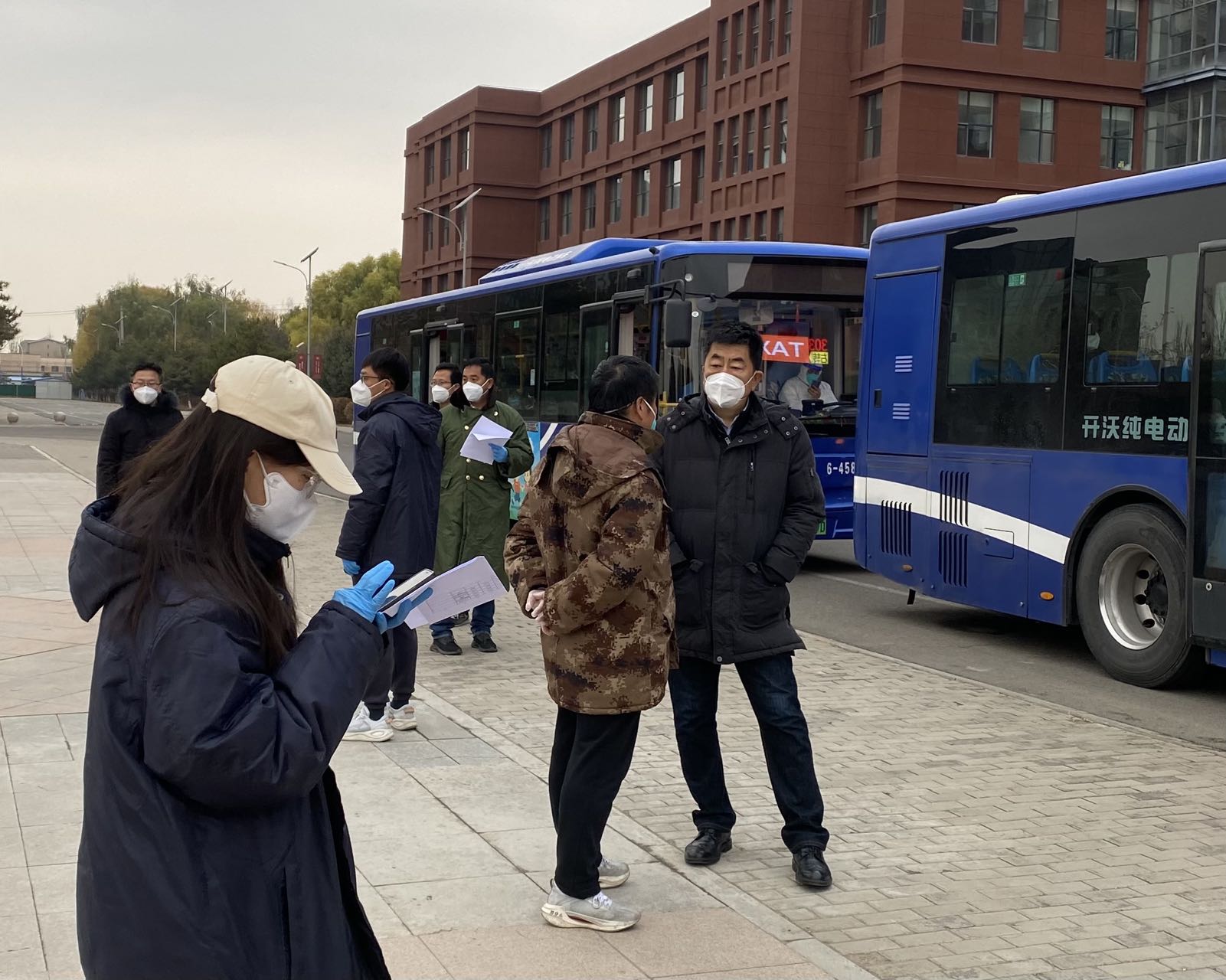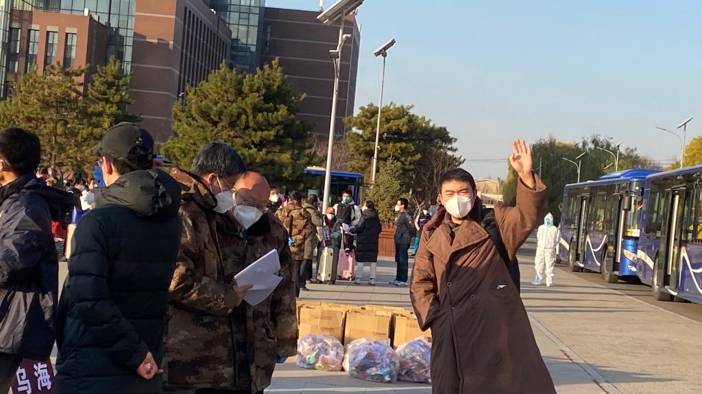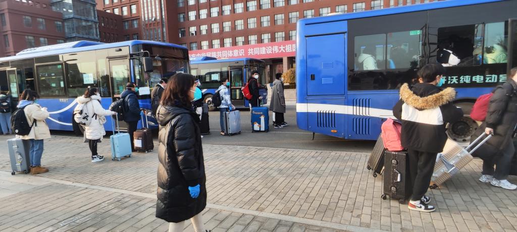 与此同时,院长米彦青正带领驻校教师组织学院最大规模的赤峰、通辽、锡林郭勒盟籍共166名学生按批次上车。米彦青老师站在广场上大声给学生点到,生怕1名孩子落下,反复叮嘱孩子们戴好口罩,做好防护,看管好行李。而驻校老师们争先恐后抢着每天凌晨送学生登车返乡,觉得自己多做一点,团队伙伴就能稍微歇歇喘口气。