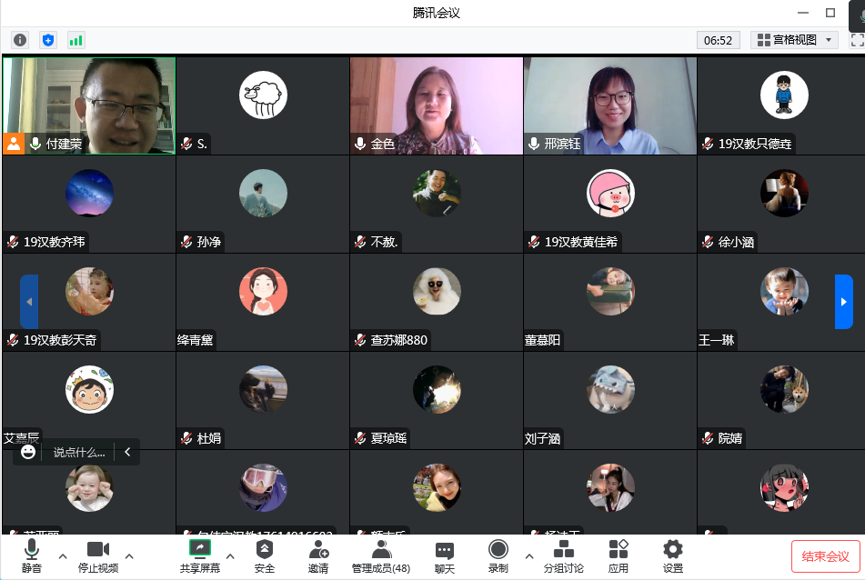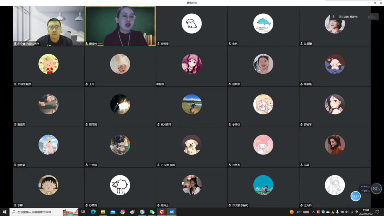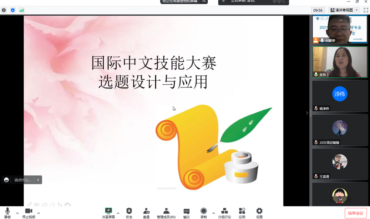 12月19日晚上19:00,汉语国际教育“国家一流本科专业建设系列讲座”第三讲开讲,我校国际教育学院赵金色老师为汉教专业同学带来了一场“国际中文技能大赛选题设计与应用”的线上讲座,讲座由汉语系主任付建荣教授主持,来自汉教专业的80余名同学参加了本次讲座。