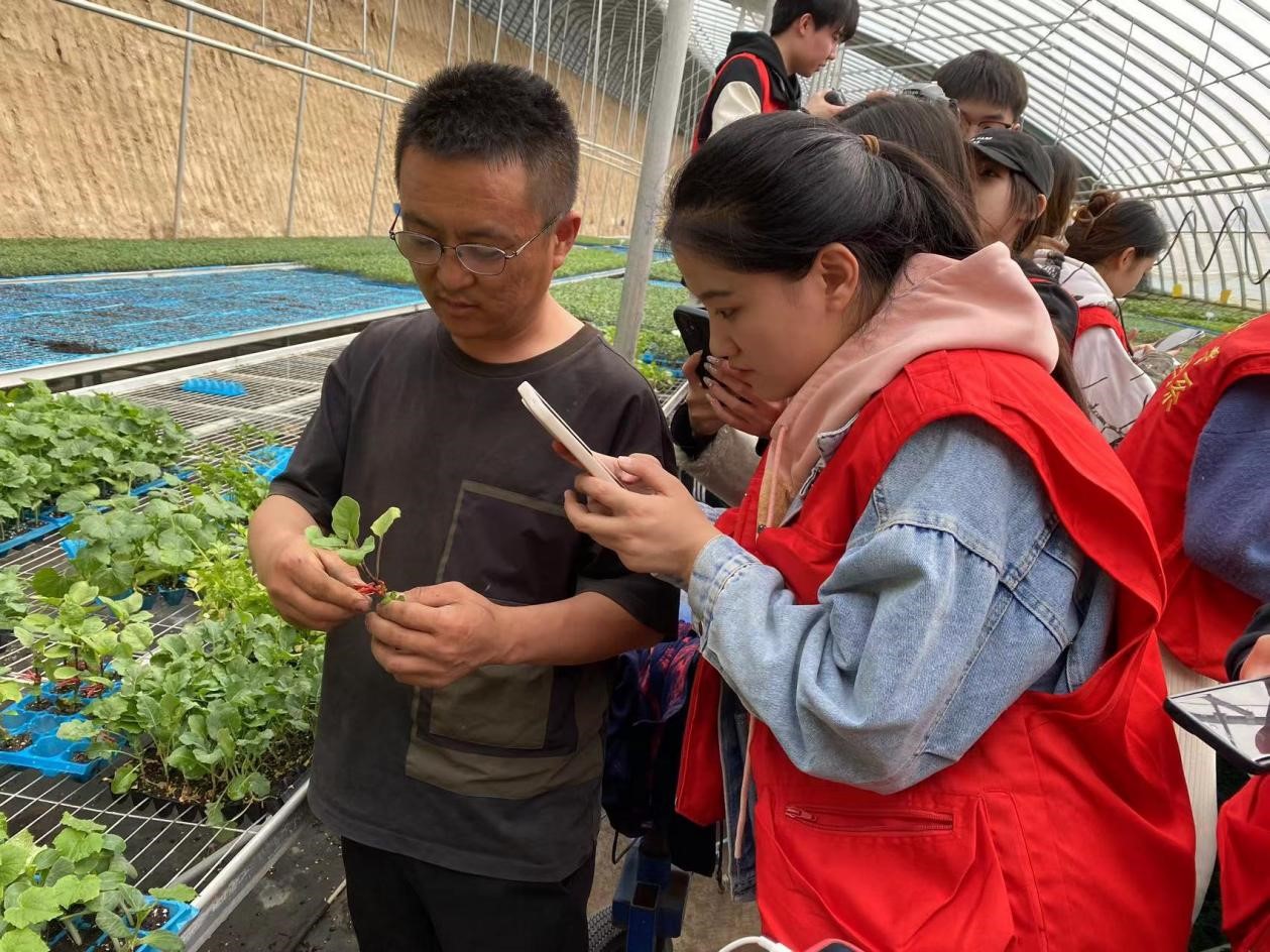 在赛罕区金河镇舍必崖村农业技术推广站永业科技服务中心,同学们了解到了金河镇温室育苗的发展概况和发展趋势。随后,同学们又来到了金河镇的主要产业基地和企业采访调研。特别是在内蒙古蒙苗农业科技有限公司的蒙番基地育苗温室,同学们实地查看了平时难以见到的蔬菜幼苗和先进的农业设备,真切感受到了科技农业与自己生活的紧密联结。