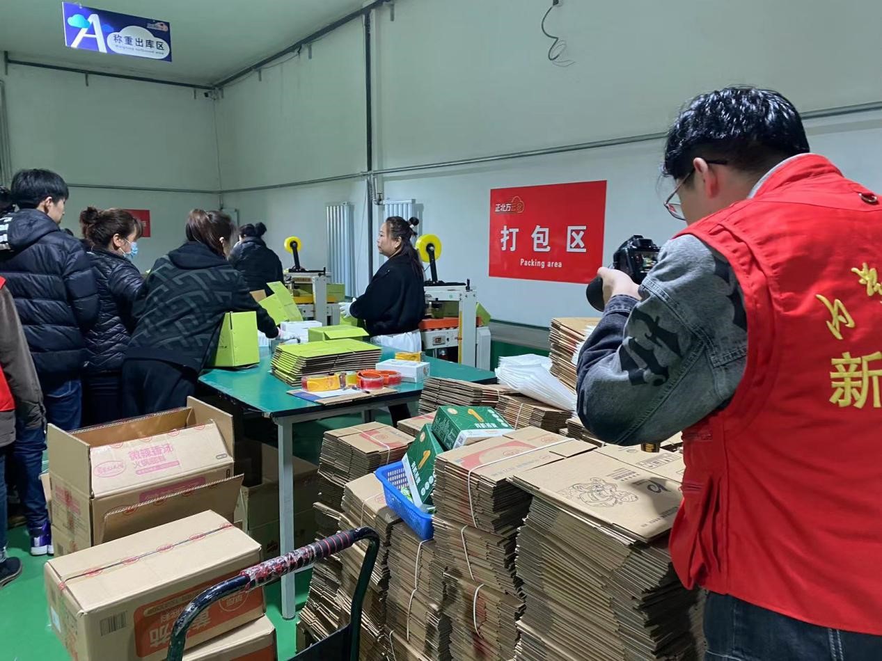 在曙光村的正北方云仓电商物流中心,同学们在工作人员的带领下参观了正北方云仓的打包车间。女工们熟练地完成自己的工序,每一环节由机器传送连接,配合紧密、井井有条。