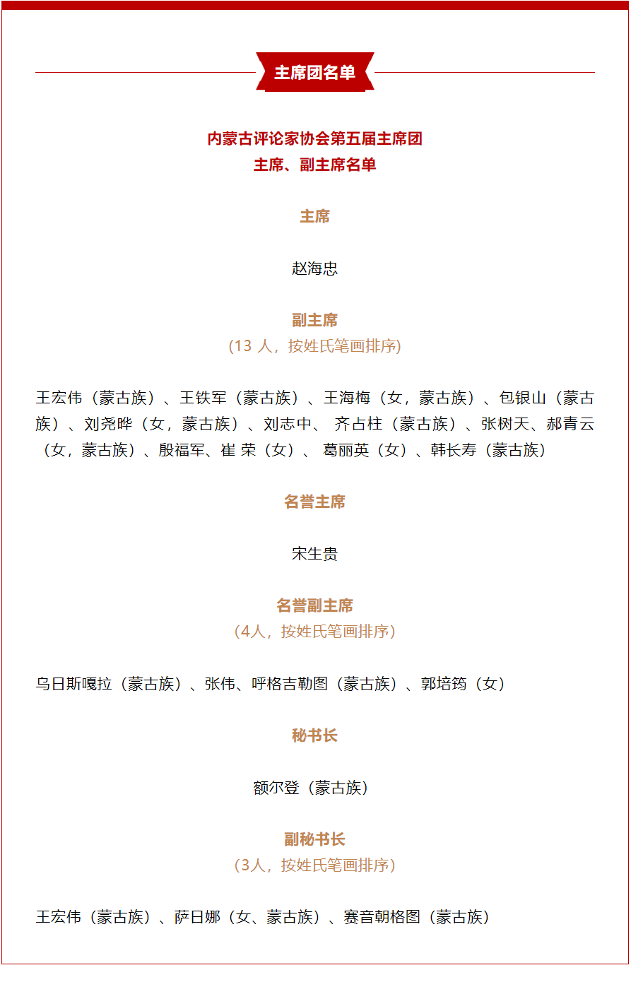 4月1日上午,内蒙古评论家协会第五次代表大会圆满完成各项议程胜利闭幕。内蒙古评论家协会第五次代表大会历时2天,87位代表参加了此次会议。会议选举产生了内蒙古评论家协会新一届领导机构,赵海忠当选为内蒙古评论家协会主席,包括我院刘志中教授,崔荣教授在内的13人当选为副主席。