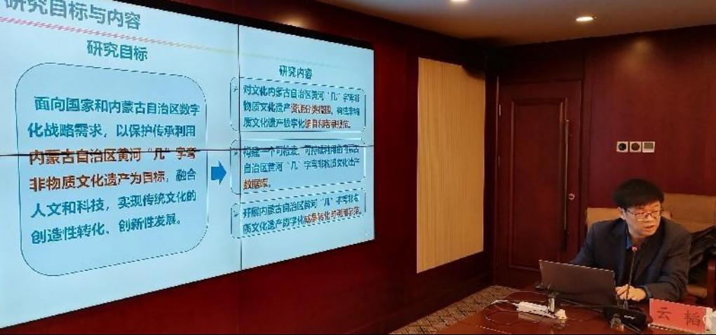 冯文开作为项目负责人介绍了项目的总体情况,云韬、杨艳如、白存良分别汇报了三个子课题的实施方案。项目组希望可以对内蒙古自治区黄河“几”字弯地区的非物质文化遗产进行数据化编目并构建数据库,进一步进行数据化开发,实现对数据化成果的转换利用。