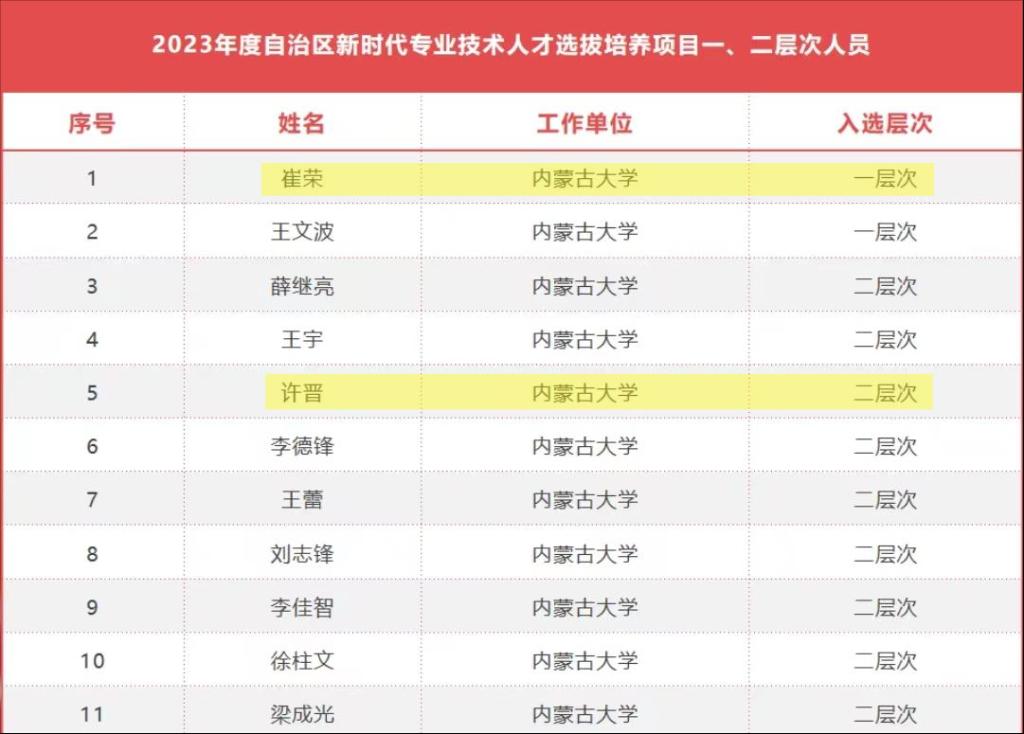 近日,自治区人力资源和社会保障厅公布了2023年度自治区新时代专业技术人才选拔培养项目一、二层次人员名单。按照《关于开展2023年全区“新时代专业技术人才选拔培养项目”人选选拔培养工作的通知》(内人社办发〔2023〕147号)安排部署,经个人申报及单位推荐,我院教师崔荣入选自治区新时代专业技术人才一层次项目;我院教师许晋入选自治区新时代专业技术人才二层次项目。