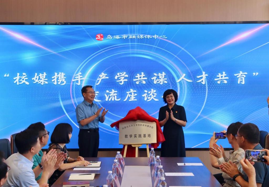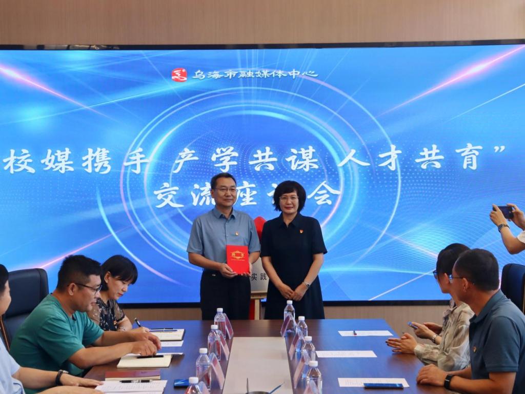 实践活动尾声,乌海市融媒体中心相关负责人与我院师生共同开展“校媒携手 产学共谋 人才共育”交流座谈活动,各实践小组分享汇报实践成果及心得。乌海市融媒体中心党委书记、主任戴军,总编辑郭臣,党委副书记杨延岭,总编室主任闫琪,党群工作部主任刘金平,采集新媒体部主任潘杰与我院教师就实践教学、学生就业、人才培养等展开深入探讨,双方负责人共同为yl23455永利集团教学实践基地揭牌,我院党委书记张丽萍为戴军书记颁发校外研究生导师聘书。