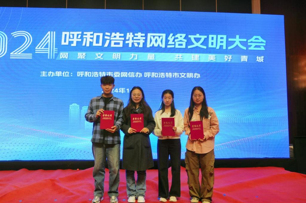 11月22日下午15:00,呼和浩特市委网信办与呼和浩特市文明办主办的网络文明大会在内蒙古饭店草原丝路厅成功召开。在此次大会中,我院学子牛佳的《青城·秋》、牛子萌的《我的青城秋日》、赵心语的《呼和浩特的秋》、吕效闻的《呼和浩特的秋》以及周正莉的《一叶知秋》在“呼和浩特市2024年网络文化节——互联网伴我成长”主题作品征集活动中荣获奖项。