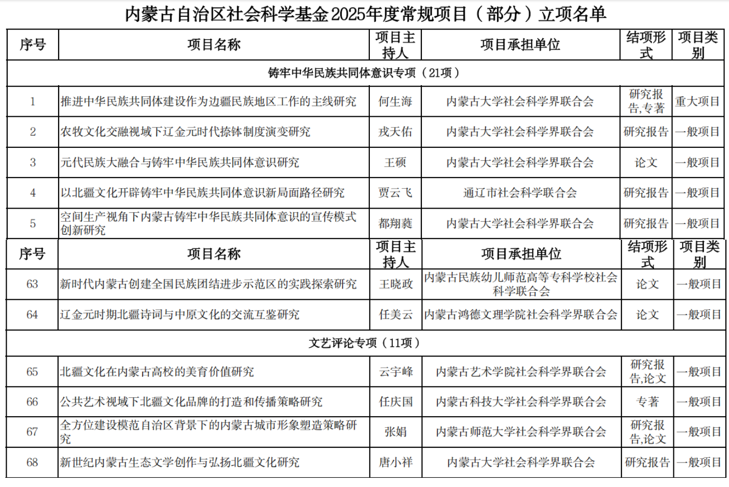 立项课题包括:王硕《元代民族大融合与铸牢中华民族共同体意识研究》(论文成果)、唐小祥《新世纪内蒙古生态文学与北疆文化传承研究》(研究报告)、都翔蕤《空间生产视域下内蒙古铸牢中华民族共同体意识传播模式创新》(研究报告)。