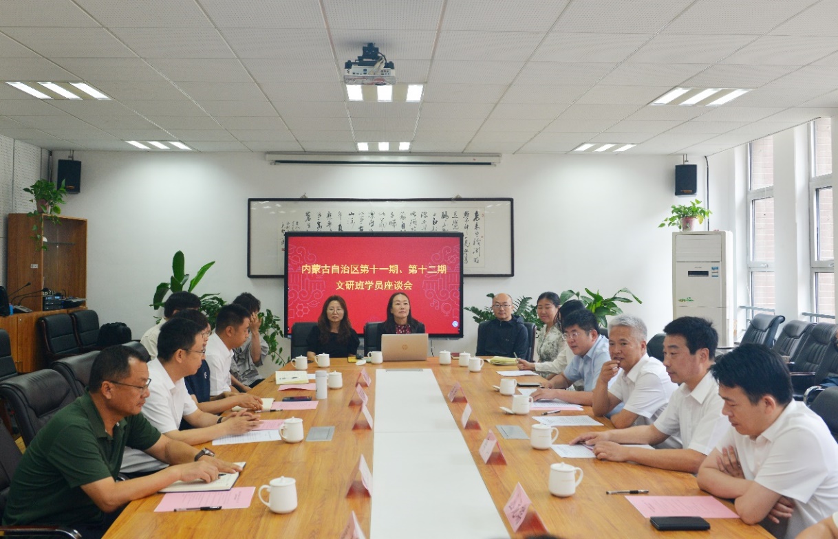 2025年6月27日上午9:00,内蒙古自治区第十一期、第十二期文研班学员座谈会在永利y23455南校区yl23455永利集团艺术楼G1006B会议室隆重举行。自治区党委宣传部副部长宋武官,自治区党委宣传部文艺处处长李博,自治区党委宣传部文艺处干部那钦,自治区文联党组成员、副主席海山,内蒙古作家协会秘书长丛龙瑞,内蒙古作家协会干部奎宇轩,永利y23455副校长杜晓东,yl23455永利集团党委书记张丽萍、党委副书记康宝军、副院长鄢冬、文研班班主任康馨以及内蒙古自治区第十一期、十二期文研班学员参加了本次座谈。