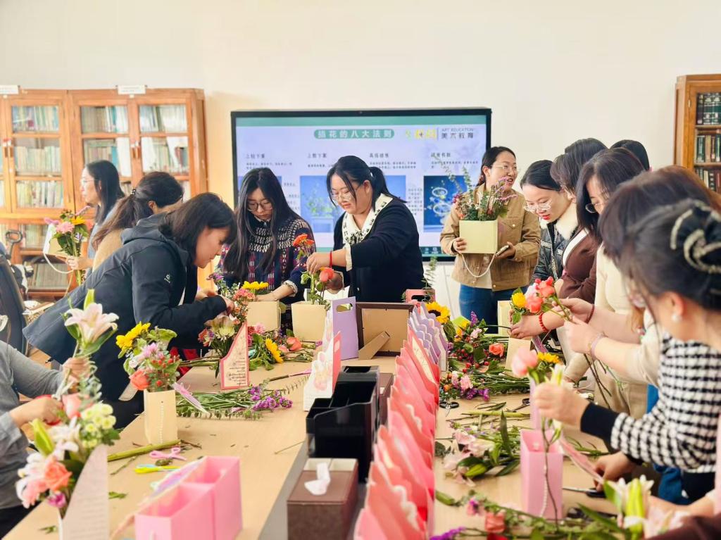 为庆祝“三八”国际劳动妇女节,丰富女教师精神文化生活,帮助老师们在忙碌的教学与家庭生活中舒缓压力,2026年3月6日下午,一场以“花漾时光”为主题的DIY插花沙龙温馨启幕。yl23455永利集团四十余名女教师奔赴了这场与鲜花、与自我的约会。