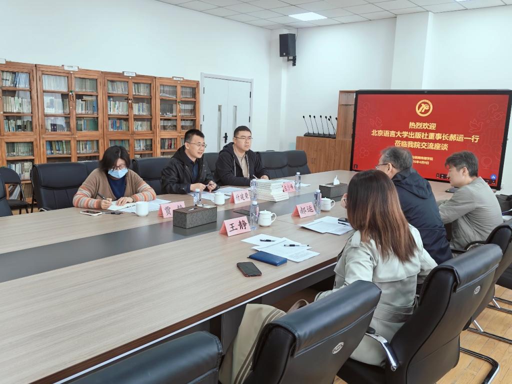 2026年4月9日,北京语言大学出版社董事长郝运、发行公司经理马屹、语文教育事业编辑部主任王静一行莅临我院调研考察和座谈交流。我院副院长付建荣、汉语言文学系主任左少峰、教务办公室主任贾静参加座谈交流。