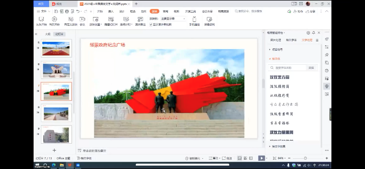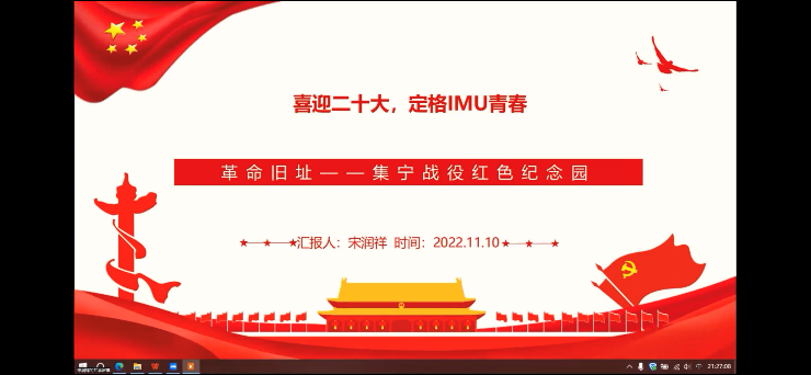 2021级中国语言文学的宋润祥同学向大家介绍了家乡的红色遗址——集宁战役红色纪念园,园中有绥蒙政府纪念广场、将军园、集宁战役指挥部旧址等等,这些红色地标都是英雄们留给我们的纪念。她的讲解让同学们感受到了革命先辈的爱国之情,她说:“我们如今的幸福生活,都是由英雄、烈士们的流血牺牲换取来的,我们应该加倍珍惜当下的幸福生活,保持对和平的追求和居安思危的意识。先辈们走过的是英雄的历史,而我们迎接的是光明的未来!”