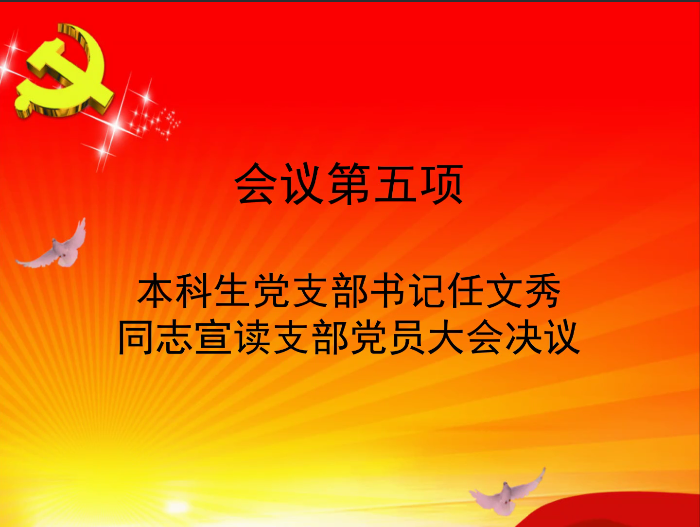 本次会议以讨论接收薛涌浑、李瑾、闫彤三位预备党员转为正式党员为主要议题。会议首先清点到会人数。会议第一项,薛涌浑、李瑾、闫彤三位同志宣读了转正申请书,汇报了预备期一年来的个人情况。支部书记任文秀老师介绍了三位预备党员在预备期一年内的表现及考察情况。