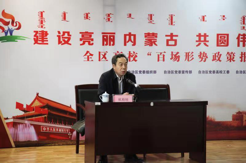 按照学校党委宣传部统一部署,结合永利y23455社科联的工作安排,11月27日下午,yl23455永利集团在南校区主楼阶2A举办了“建设亮丽内蒙古 共圆伟大中国梦”形势政策报告会。会议邀请自治区社会科学界联合会党组书记、主席杭栓柱作了《乡村振兴战略解读》专题报告。学院党总支副书记吴栓虎主持了报告会,副院长米彦青、部分青年教师和二百余名本科生、研究生参加了报告会。