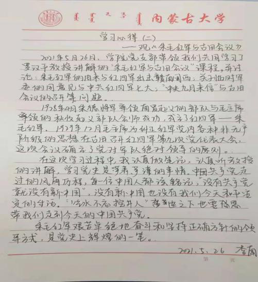 为庆祝中国共产党成立100周年,深入学习贯彻习近平新时代中国特色社会主义思想和党的十九大精神,从党的百年伟大奋斗历程中汲取继续前进的智慧和力量,我院本科生党支部积极响应号召,开展了线下集中学习党史学习教育。