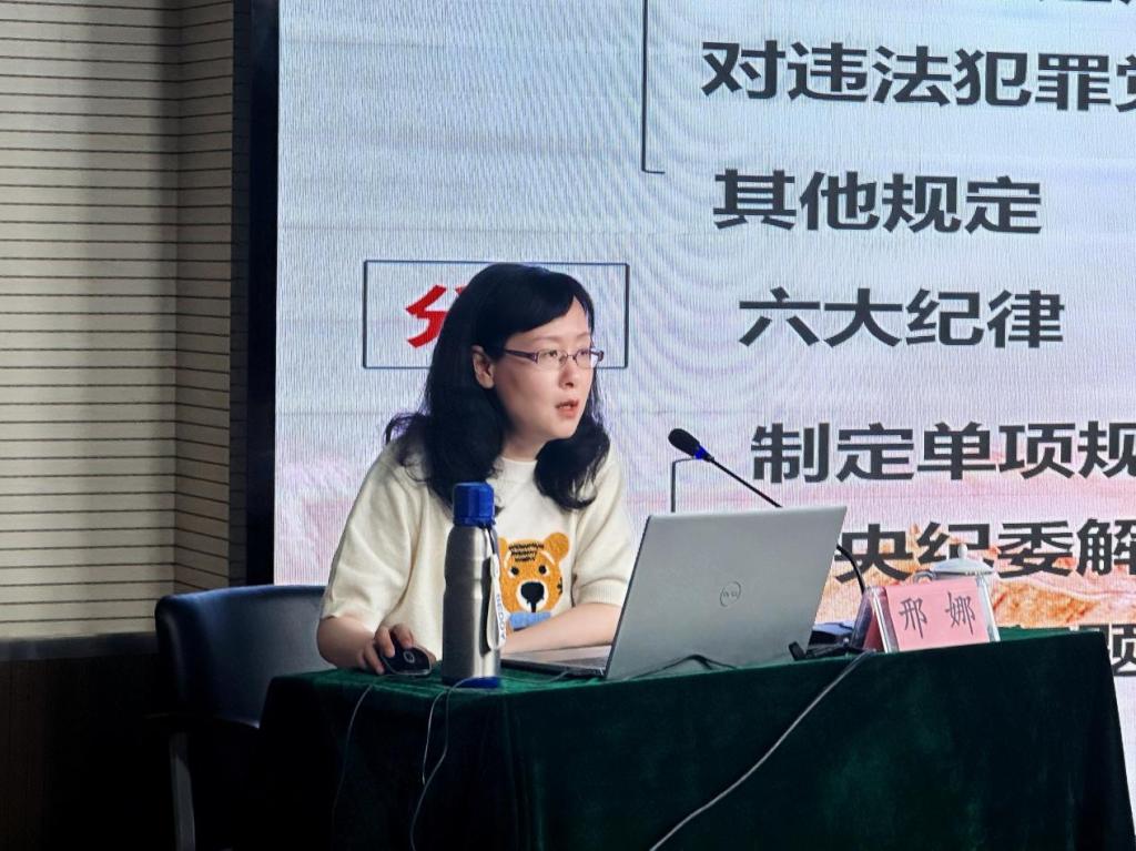 为进一步学习贯彻《中国共产党纪律处分条例》(以下简称《条例》),5月21日晚,我院邀请法学院教师邢娜于玉泉校区卓越楼一楼演播大厅开展党纪学习教育专题讲座第二讲。本次讲座由我院党委书记张丽萍主持,本科生党支部书记任文秀、研究生汉语系党支部书记冯坤、本科生辅导员张淼及我院党员参与讲座。