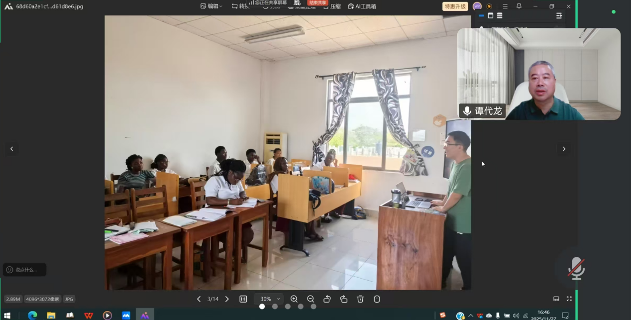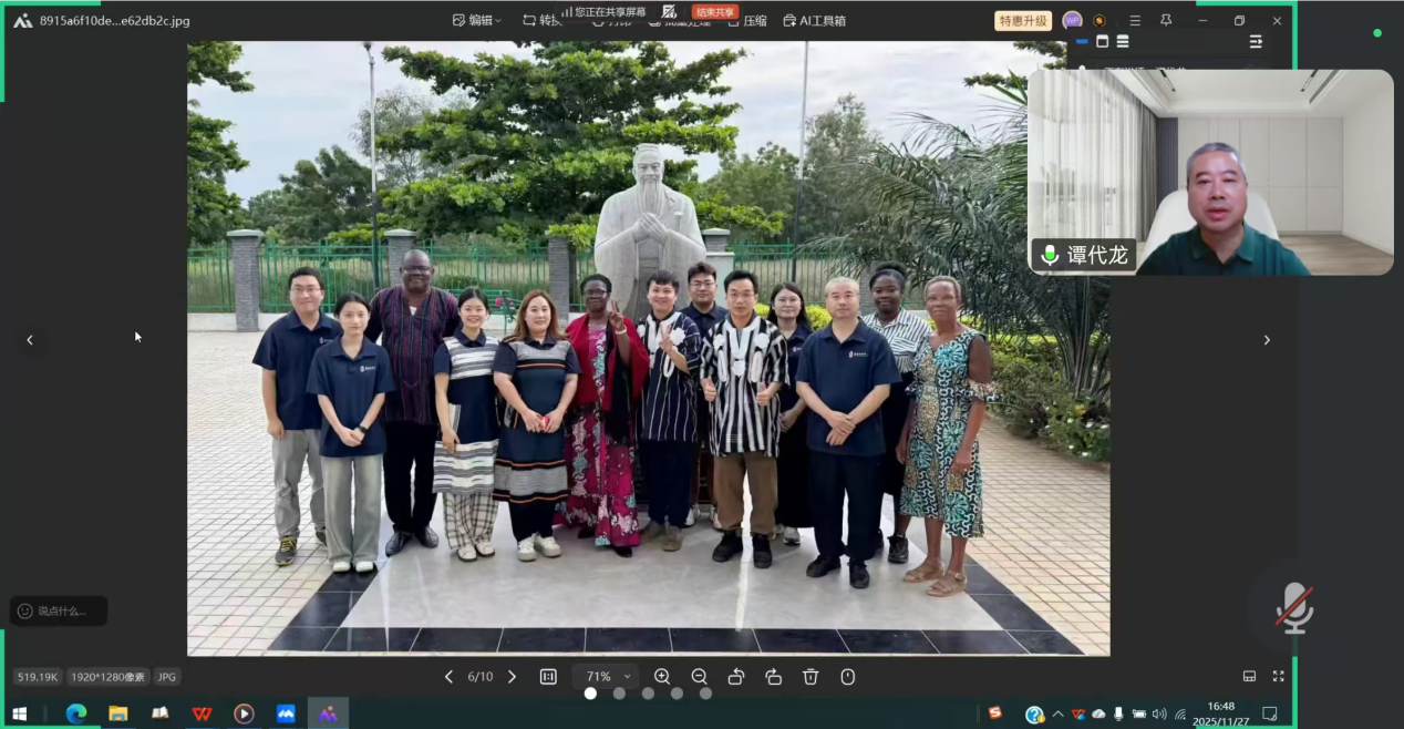 2025年11月27日下午15:00,我院特邀四川外国语大学中文学院教授、多哥洛美大学孔子学院中方院长谭代龙为汉语国际教育专业同学带来了一场“西非地区孔子学院日常运行与师资需求”的线上专题讲座。讲座由学院副院长付建荣教授主持,语言学教研室负责人李慧贤老师出席,吸引了60余名同学积极参与。