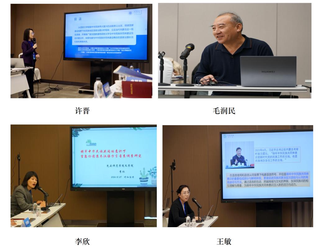 随后有五位专家学者进行了主旨报告。许晋教授以《内蒙古语言治理生态体系的融合构建》为题,结合内蒙古语言生活与语言治理实际,从理论和实践、历史与现实、国内和国际三大维度,聚焦语言治理理念、治理环境治理内容、治理结构、治理技术五大子体系,探讨构建内蒙古语言治理生态体系的逻辑基础和实践路径。毛润民老师从“公母俩(儿)”分布的普遍性探讨了早期姑舅关系这种亲上做亲的婚姻关系;李欣副教授汇报的题目为《铸牢中华民族共同体意识下吉忽伦图苏木汉语方言音系调查研究》,尝试阐释吉忽伦图苏木汉、蒙两族汉语方言音系之间的铸牢中华民族共同体意识逻辑关系,预测国家通用语言文字使用背景下吉忽伦图苏木汉语方言音系可能的发展方向。王敏副教授以《民族地区铸牢中华民族共同体意识视域下的语言认同研究》为题,通过对静态文献材料的深入分析,探讨汉语与民族语言的互动关系,并探究语言符号中蕴含的中华民族共同体意识的基因。蔡文婷副教授在《乡村振兴视域下的内蒙古自治区国家通用语言文字教育效果提升路径》一文中,从师资保障、教师语用水平、青少年语言能力社会推广诸角度阐释了窒碍内蒙古地区通用语言文字教育高质量发展的客观因素及实际困难,旨在提出乡村振兴视域下充分发挥高校语言服务职能,提升国家通用语言文字教育效果的实践路径和解决方案。