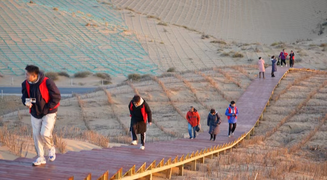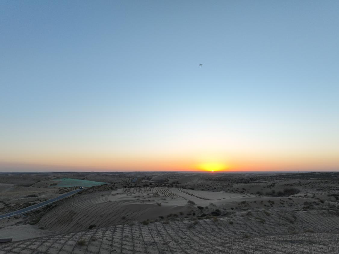 夕阳西下,余霞成绮,大漠如波,汽车穿行在毛乌素沙地腹部的蜿蜒公路上。转弯处,一轮火红落日镶嵌在茫茫大漠的地平线,把整个沙地染上一层金色。初冬的毛乌素沙地,无数道沙砾涌起的褶皱如凝固的波涛,一直延伸到天际。行进在这片沙地上的永利y23455新闻系师生被一番景象震撼:方格沙障如恢恢大网,将流动的沙丘牢牢固定。大家不仅惊叹于日落大漠、沙障遍野的奇观,还有这背后乌审人世世代代在沙窝窝里提着铁锹、扛着锄头、流着血汗的七十余年奋斗史。